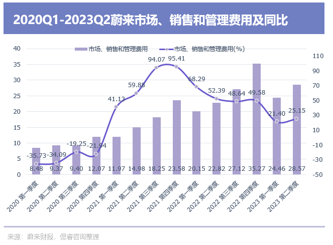 而凈利潤(rùn)大幅下滑,在于蔚來(lái)仍在重投入:二季度蔚來(lái)汽車銷售、一般及行政費(fèi)用達(dá)到28.57億元,同比增長(zhǎng)25.2%。相較之下,理想汽車和小鵬汽車銷售費(fèi)用分別為23.1億元和15.4億元。