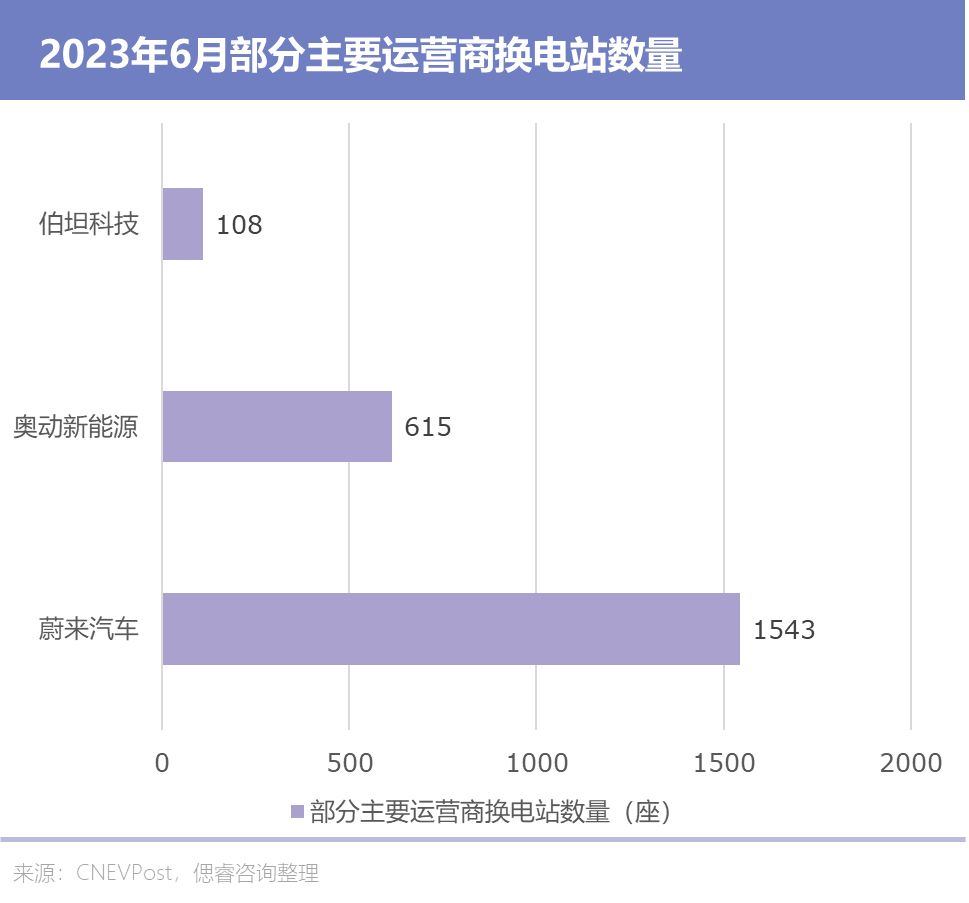 根據(jù)中國(guó)新能源國(guó)家大數(shù)據(jù)聯(lián)盟數(shù)據(jù),2023年6月,全國(guó)共建立換電站2266座。CNEVPost統(tǒng)計(jì),中國(guó)換電市場(chǎng)Top 3分別為:蔚來(lái)汽車、奧動(dòng)新能源以及伯坦科技。其中,蔚來(lái)?yè)Q電站數(shù)量最多,占總數(shù)的68%。奧動(dòng)新能源和伯坦科技分別擁有 615 個(gè)和 108 個(gè)電池交換站,份額分別為 27% 和 5%。但與后兩家企業(yè)主要面向更通用化的出租車市場(chǎng)不同的是,蔚來(lái)?yè)Q電僅面向蔚來(lái)車主。