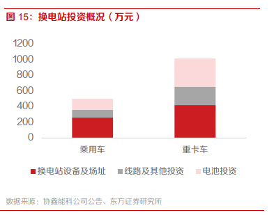 據(jù)東方證券統(tǒng)計(jì),目前乘用車換電站單站投資額約 500.7 萬(wàn)元,其中場(chǎng)地、設(shè)備、建站費(fèi)用所在的換電站設(shè)備類別占總投資比例的 41-52%;其次為初期備用電池投資,約占全部投資的28-35%;最后為線路及其他投資占比 20%-23%。