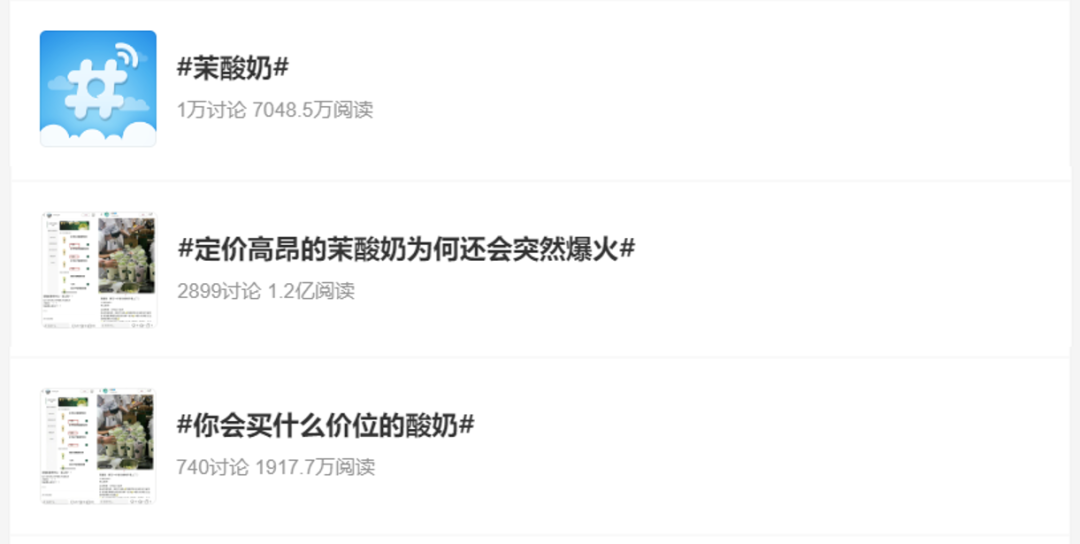 以茉酸奶牛油果酸奶奶昔為代表的酸奶飲品火遍全網(wǎng),在小紅書的打卡、復(fù)刻等相關(guān)筆記就有7w+。圍繞現(xiàn)制酸奶新品、定價、配料的相關(guān)話題接連登上微博熱搜榜前列。