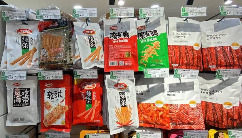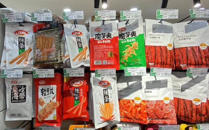 界面新聞?dòng)浾咦咴L北京某超市獲悉,衛(wèi)龍袋裝產(chǎn)品價(jià)格在4至6元之間,其中大面筋106g、衛(wèi)龍魔芋爽50g、衛(wèi)龍親嘴豆皮65g的標(biāo)價(jià)均接近6元。