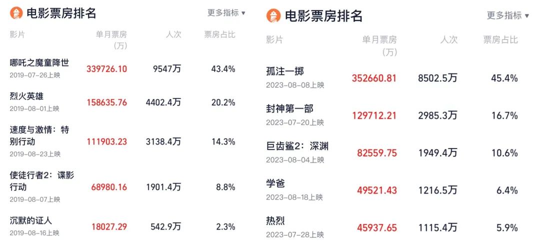 從票房結(jié)構(gòu)來看,都是“一超多強”,單月砍下35.3億的票房冠軍《孤注一擲》,實質(zhì)上比2019年的超級爆款《哪吒之魔童降世》還要更猛,后者當年8月單月也只有34億。因此,頭部已經(jīng)實現(xiàn)了超常發(fā)揮,頭部之外卻鮮有影片能跟上。