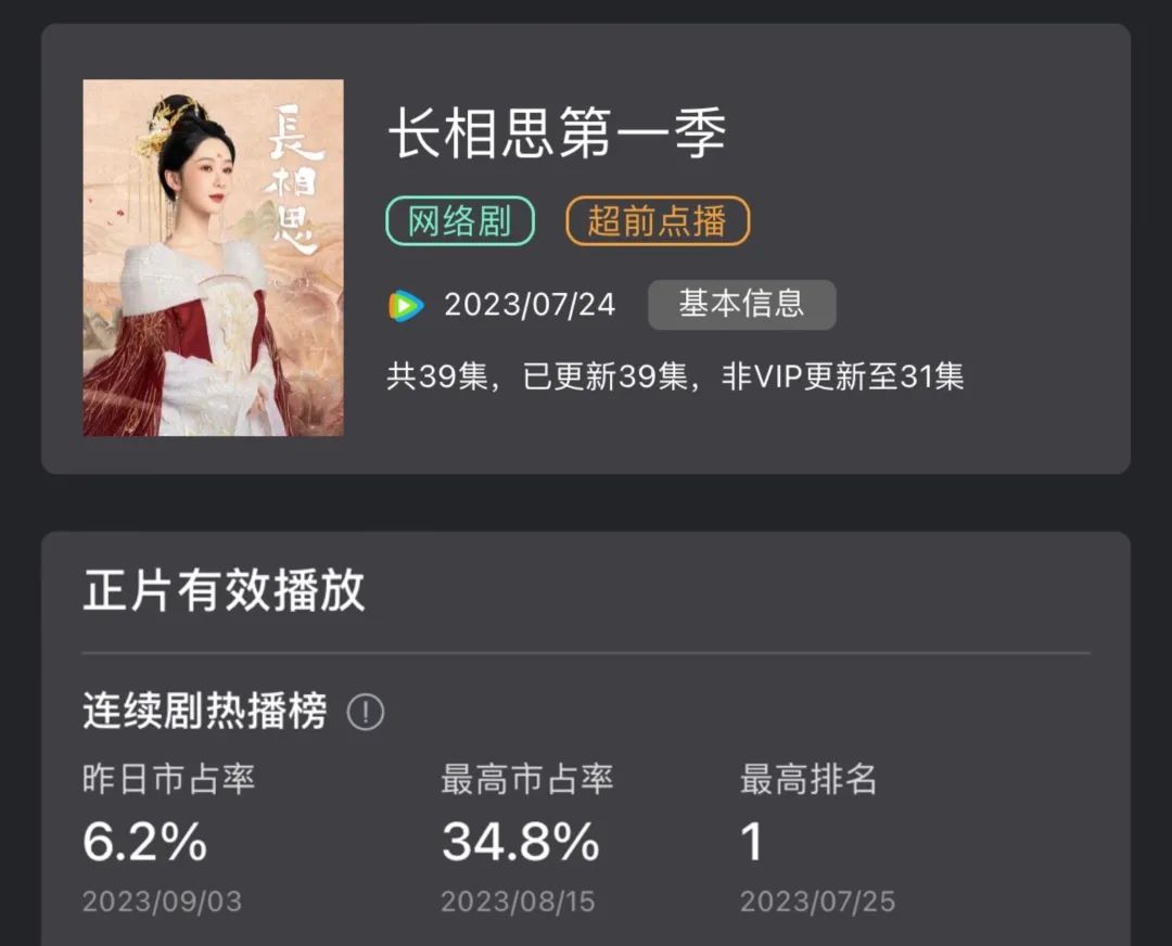 根據(jù)云合數(shù)據(jù)顯示,《長相思第一季》累計26.5億有效播放、單日有效播放市占率破30%位居首位,與去年暑期檔爆款《星漢燦爛》《夢華錄》數(shù)據(jù)相當。