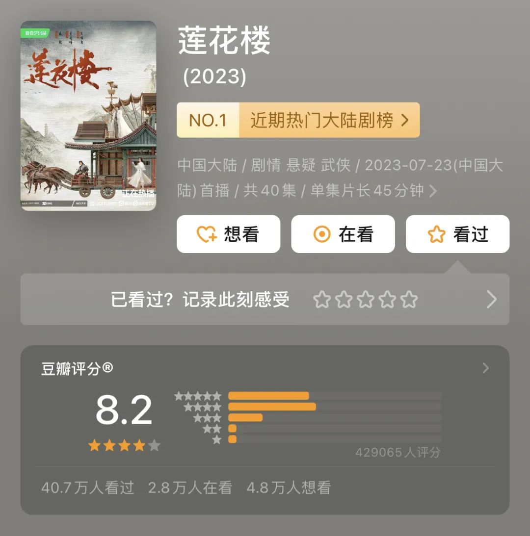 與《長相思第一季》只差一天開播的《蓮花樓》開播初期,熱度不足,隨著后面劇情的鋪展,熱度一路走高,8月6日登陸央視,影響擴大,評分也隨之升高,從開分8.0上漲到了8.2,大結(jié)局加更禮當天,以破萬熱度的成績高調(diào)收官。