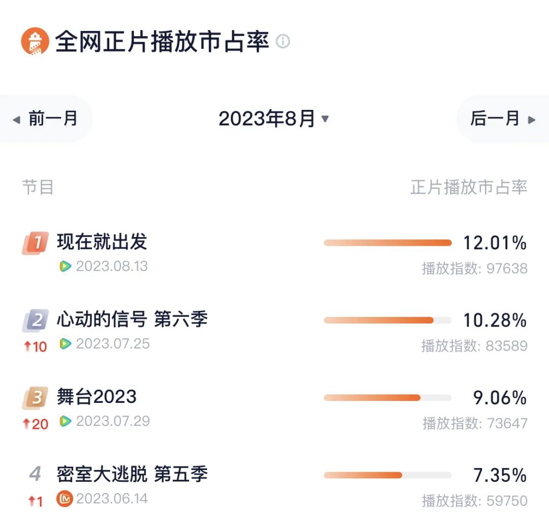 表現(xiàn)最為突出的,是戶外真人秀《現(xiàn)在就出發(fā)》。這檔節(jié)目主打“充電旅行”,走入自然美景沉浸式玩樂,加上“顯眼包”嘉賓聚在一起的化學反應和魏大勛孟宴臣的熱度未退,熱度表現(xiàn)亮眼。8月13日首播,到了月底就已經(jīng)強勢登頂燈塔專業(yè)版正片播放市占月榜,正片播放市占率高達12.01%,用三期節(jié)目收獲了超過2000個熱搜話題和累計6億的短視頻播放量。