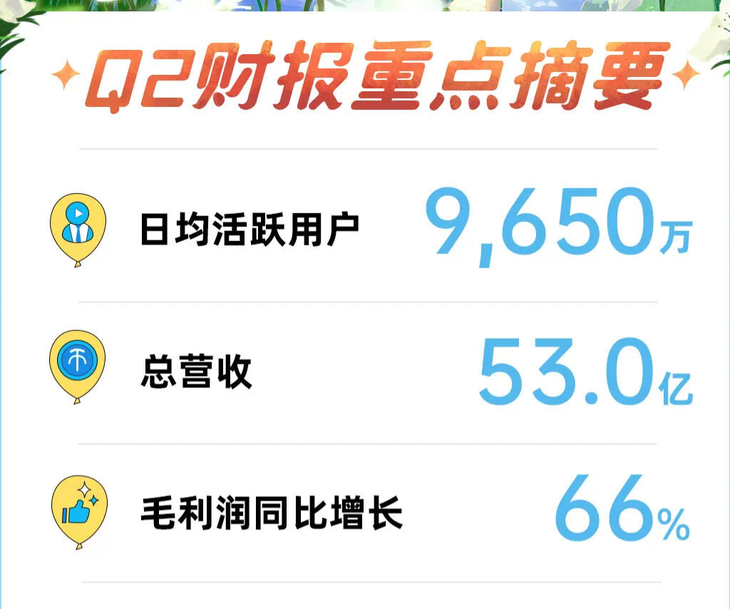 最引人注目的是B站。8月17日,B站公布了2023年第二季度財報。數(shù)據(jù)顯示,第二季度B站日均活躍用戶達9650萬,同比增長15%。用戶日均使用時長94分鐘,創(chuàng)同期歷史新高。同時,本季度B站總營收達53億元人民幣,毛利潤同比增長66%,毛利率連續(xù)四個季度持續(xù)提升,調(diào)整后凈虧損同比大幅收窄51%。