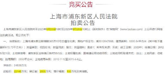 國內(nèi)一家大型拍賣網(wǎng)站的信息顯示:一棟建筑面積為1300.84平方米的花園住宅,自8月25日-8月28日由上海浦東新區(qū)法院公開進(jìn)行網(wǎng)絡(luò)拍賣。