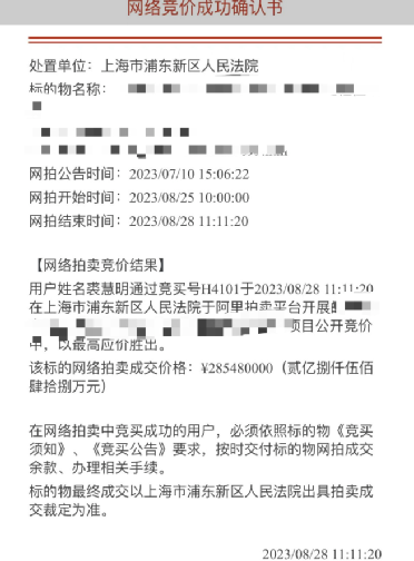 拍賣公告還指出:拍賣成交余款(拍賣成交款扣減保證金)須于2023年9月25日16時(shí)前以買受人(或到本院辦理過授權(quán)的代理人)賬戶繳入法院指定賬戶。