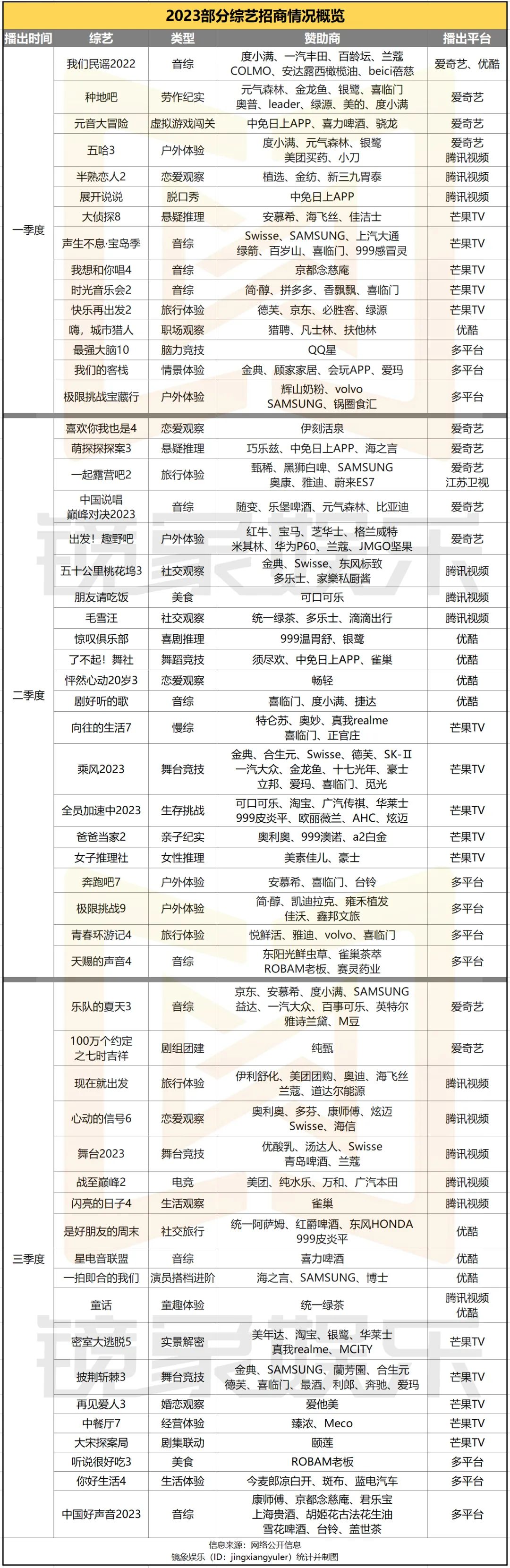 此外,高產(chǎn)的音樂賽道對品牌方也有著持續(xù)的吸引力。綜N代方面,《中國好聲音2023》《樂隊的夏天3》的招商列表中,分別站著8家、10家贊助商。新綜藝方面,年初熱播的《我們民謠2022》也拿到度小滿、一汽豐田、蘭蔻等7家品牌合作;迎來第二季的《聲生不息·寶島季》也有7家贊助商。