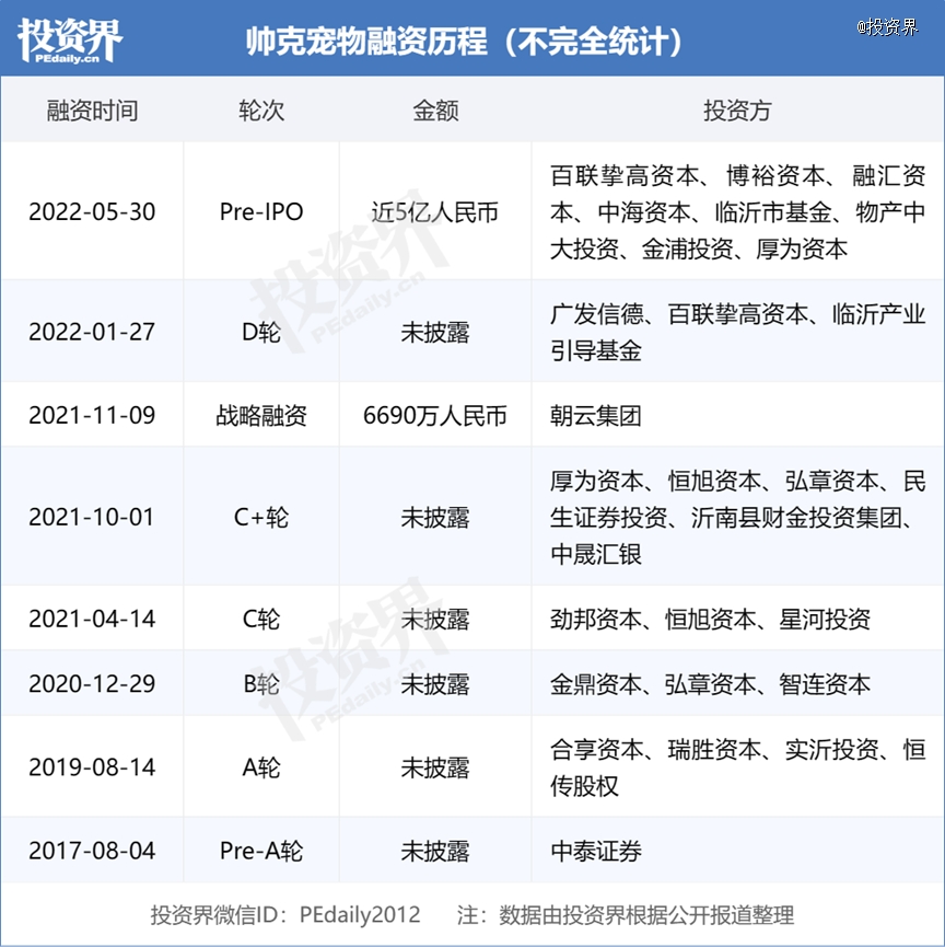 去年5月,帥克寵物完成一筆5億元Pre-IPO輪融資,由百聯(lián)摯高資本與博裕資本領(lǐng)投,陽光融匯、芒果基金、中海資本、臨沂市基金等跟投,創(chuàng)造了當(dāng)時國內(nèi)寵物行業(yè)最大一筆融資。