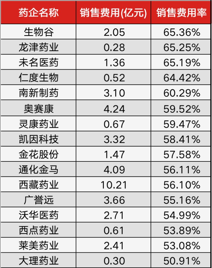 65.4%,這是排除處于商業(yè)化早期的創(chuàng)新藥企情況后,藥企最高的銷售費用率。也就是說,有藥企每收入100元,就要投入65元做營銷。