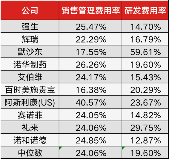 如下圖所示,海外藥企巨頭銷售管理費用在營收中的合計占比約在16%-40%之間,中位數(shù)為24.06%。即,海外成熟藥企中,約四分之一的營收花費在企業(yè)日常運營管理和營銷,研發(fā)費用的支出則是五分之一,研發(fā)與銷售費用基本持平,屬于雙輪驅(qū)動。