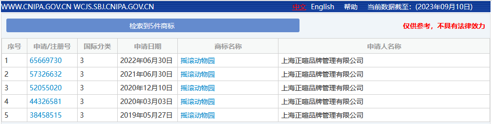據(jù)中國(guó)商標(biāo)網(wǎng)顯示,搖滾動(dòng)物園3類(lèi)日化商標(biāo)狀態(tài)為已注冊(cè),申請(qǐng)人為上海正喧。此外,搖滾動(dòng)物園天貓旗艦店、微信公眾號(hào)的運(yùn)營(yíng)者認(rèn)證主體也均為上海正喧。
