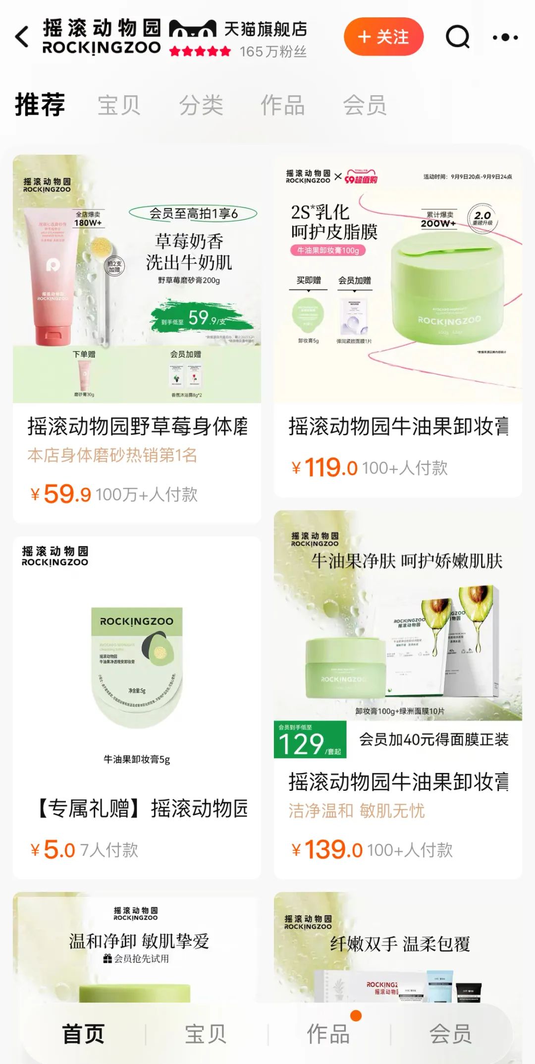 截至目前,搖滾動(dòng)物園天貓旗艦店粉絲數(shù)為165萬(wàn),產(chǎn)品價(jià)格在4.95元-300.9元之間,品類(lèi)包括個(gè)護(hù)及護(hù)膚類(lèi)產(chǎn)品。其中,售價(jià)在59.9元-109.8元之間的野草莓身體磨砂膏銷(xiāo)量最高,付款人數(shù)超100萬(wàn);另有一款售價(jià)在89元-169元間的牛油果卸妝膏,付款人數(shù)也超70萬(wàn)。