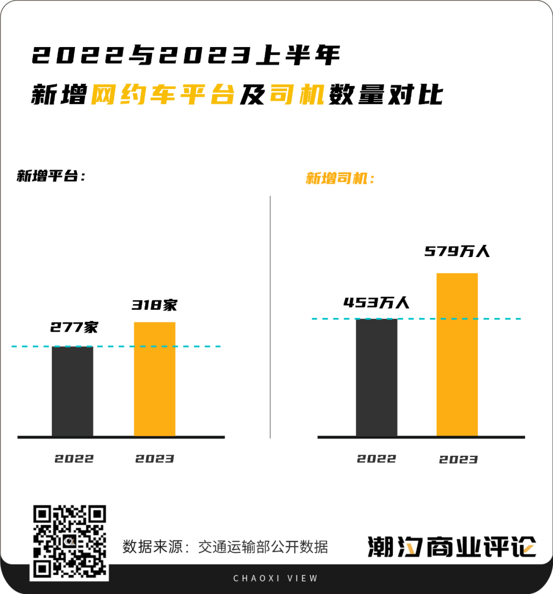 而與2022年同期相對比,僅一年時間網(wǎng)約車行業(yè)便涌入了41家平臺,以及多達126萬名駕駛員。