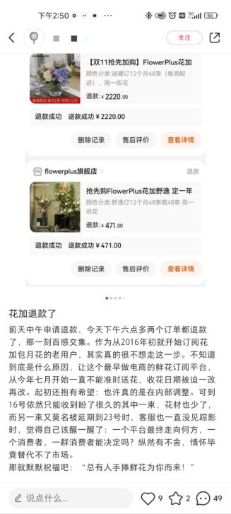 在小紅書上,一名常年訂花的用戶發(fā)帖稱,此前的訂單終于退款了,從7月起花加就不能做到定時送花了,購買的鮮花一再被延遲配送,最終決定申請退款。