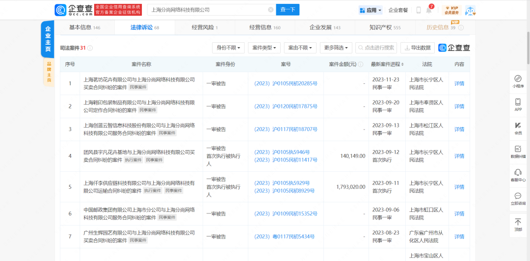 根據(jù)企查查顯示,花加母公司上海分尚網(wǎng)絡(luò)科技有限公司,已經(jīng)出現(xiàn)15條風(fēng)險信息,其中14條都是與各個供貨商、包裝商、甚至是配送商的合作糾紛。