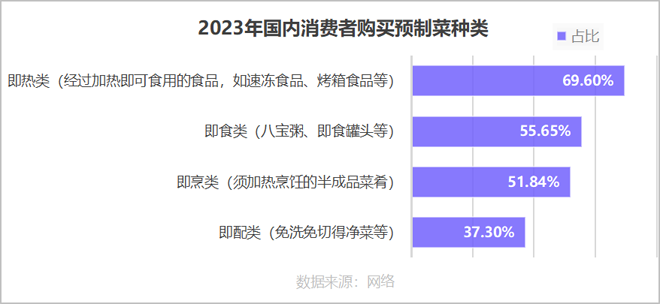據(jù)調(diào)查,2023年國(guó)內(nèi)預(yù)制菜分類消費(fèi)中,即熱類(如速凍食品)消費(fèi)占比69.6%,占比最大。占比順位為:即熱類>及時(shí)類>即烹類>即配類。