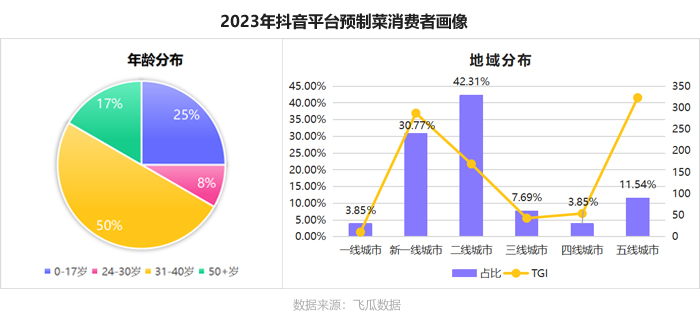 在抖音平臺(tái)上,新一線與二線城市的人群是預(yù)制菜消費(fèi)的主力軍,占比73.04%,且消費(fèi)意愿強(qiáng);在受眾年齡分布中,31-40歲人群占比50%,這部分的中青年群體也是家庭生活消費(fèi)支出的主力軍。購(gòu)買預(yù)制菜能夠在消費(fèi)者工作及家庭生活的沖突間起到一定的緩沖作用,節(jié)省了消費(fèi)者在工作之余解決溫飽的時(shí)間與精力成本。