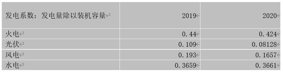 首先,基于上述論調(diào)的投資者忽視了,火電、水電、風(fēng)電與太陽(yáng)能發(fā)電之間裝機(jī)容量與實(shí)際發(fā)電的區(qū)別。我們通過(guò)以下表格來(lái)做分析。以下各種能源單位裝機(jī)量與發(fā)電量系數(shù)之間的差異: