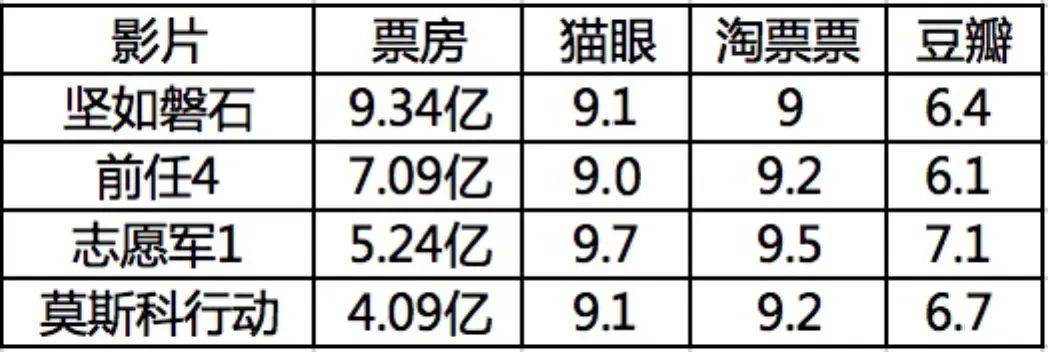 第五代導(dǎo)演的聚首,張藝謀跟陳凱歌的首次對決,《堅(jiān)如磐石》跟《志愿軍1》堪比火星撞地球;超級熱度影片的續(xù)作《前任4》;眾星云集的警匪大片《莫斯科行動》;爆款喜劇原班人馬的《好像也沒那么熱血沸騰》。如果在映前對今年國慶檔做一個(gè)前瞻,神仙打架的形容并不為過。