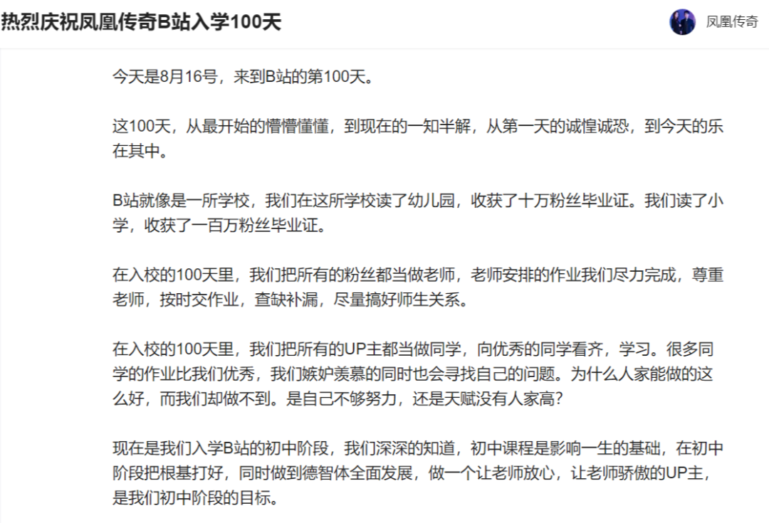 鳳凰傳奇與很多入駐B站后就消失不見的明星賬號(hào)不同,他們的團(tuán)隊(duì)實(shí)打?qū)嵉刂匾曔@個(gè)年輕人活躍的社區(qū)。入駐B站100天后,鳳凰傳奇還以學(xué)生的口吻,專門寫了一篇小作文,稱B站的觀眾為老師,虛心向大家請(qǐng)教。