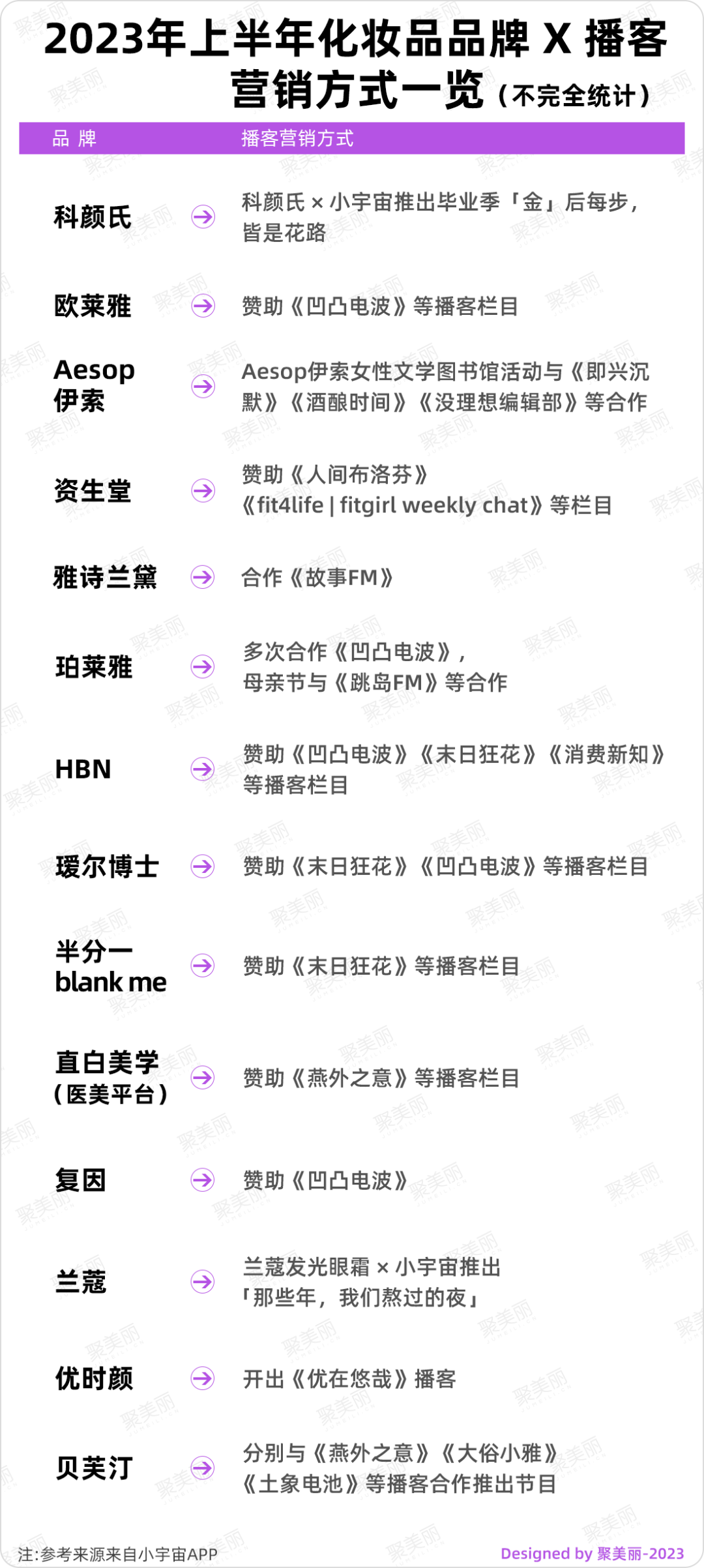 聚美麗通過盤點2023年上半年美妝品牌在播客上(主要統(tǒng)計來源為小宇宙APP)的合作及投放等,發(fā)現(xiàn)不僅國際企業(yè),國內(nèi)也有美妝品牌試水播客,以期觸達更多消費群體。