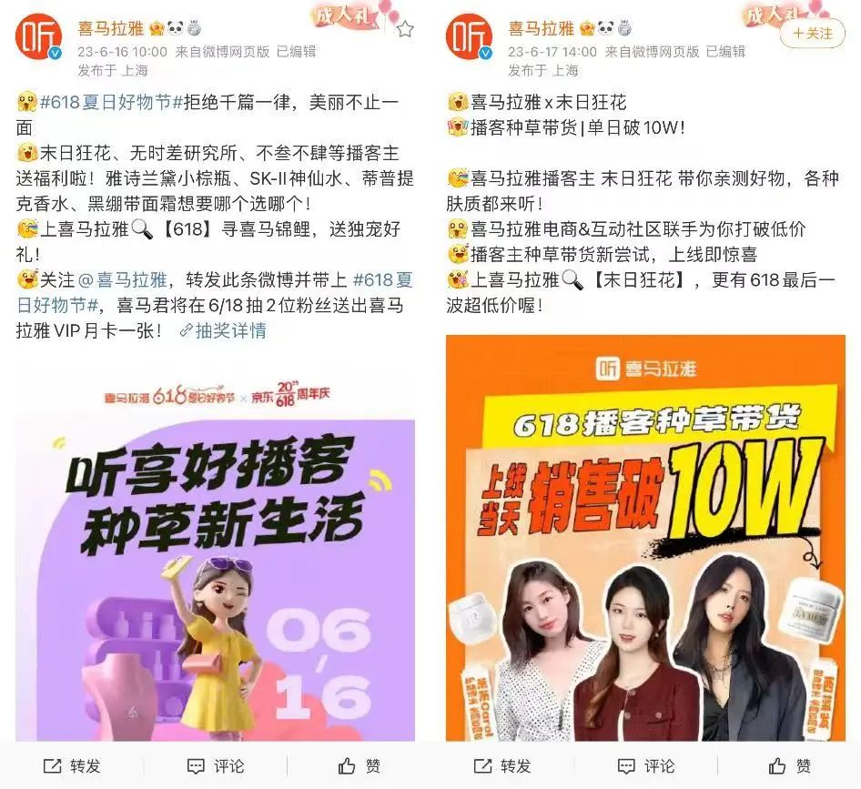值得注意的是,播客還開啟了“帶貨種草”模式。今年618,喜馬拉雅聯(lián)合京東發(fā)起“聽享好播客,種草新生活”活動,聯(lián)動多位播客主。據(jù)其微博顯示,「末日狂花」種草帶貨曾獲得單日破10萬的成績。這也在一定程度上表明播客的“帶貨”能力不容小覷。