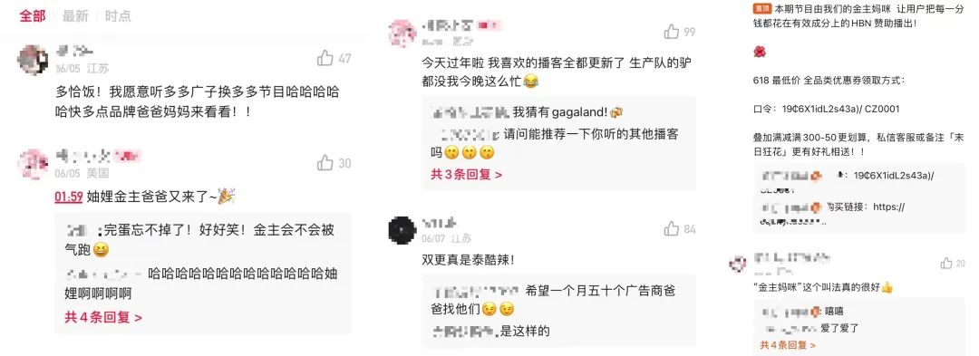 有部分美妝品牌在贊助播客節(jié)目的時候,通常會插入簡短的口播,成本較小。另一方面,播客用戶對于播客植入廣告接受度較高,簡短的廣告也不易引發(fā)用戶的反感。且優(yōu)質(zhì)播客欄目的用戶粉絲粘性強,有時評論區(qū)還會出現(xiàn)“希望金主投廣告以進行催更”的聲音。