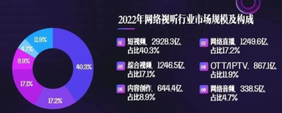 誠然,國內(nèi)網(wǎng)絡(luò)視聽行業(yè)市場規(guī)模中占比最大的當(dāng)屬短視頻板塊,據(jù)《中國網(wǎng)絡(luò)視聽發(fā)展研究報告(2023)》顯示,2022年,我國短視頻占比網(wǎng)絡(luò)視聽行業(yè)市場40.3%,網(wǎng)絡(luò)音頻占比4.7%。