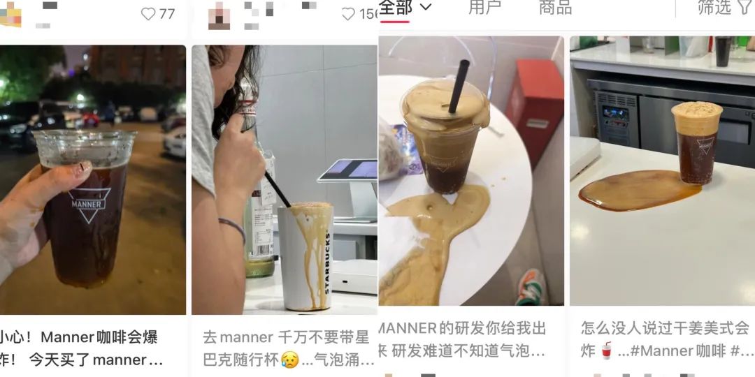 這款咖啡是Manner 前段時間推出的產(chǎn)品,在干姜氣泡水中注入咖啡液,熱濃縮與氣泡水碰撞出大量泡泡,經(jīng)過攪拌、晃動或者外力沖擊,可能會使泡沫膨脹并噴灑出來,這就是“爆炸”原因。