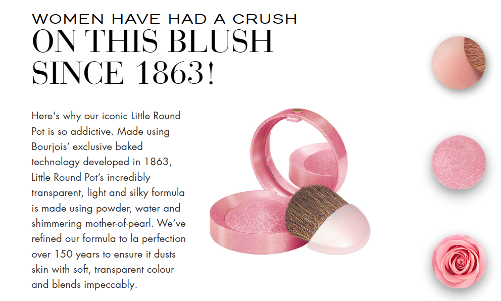 1863年,法國(guó)舞臺(tái)劇演員喬塞夫·亞伯·彭桑Joseph-Albert Ponsin因?qū)τ谘兄菩滦突瘖y品的喜愛(ài)而創(chuàng)立了妙巴黎品牌,同年他推出了世界上第一款粉狀腮紅Little Round Pot。