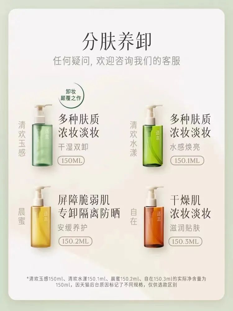 今年上半年,逐本潔顏油再次迭代升級(jí),第五代產(chǎn)品分為干濕雙卸的清歡玉感、水感煥亮的清歡水漾、安緩養(yǎng)護(hù)的晨蜜、滋潤(rùn)貼膚的自在。