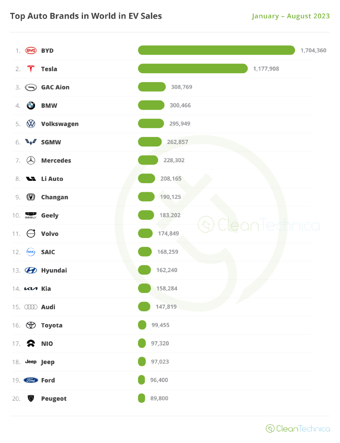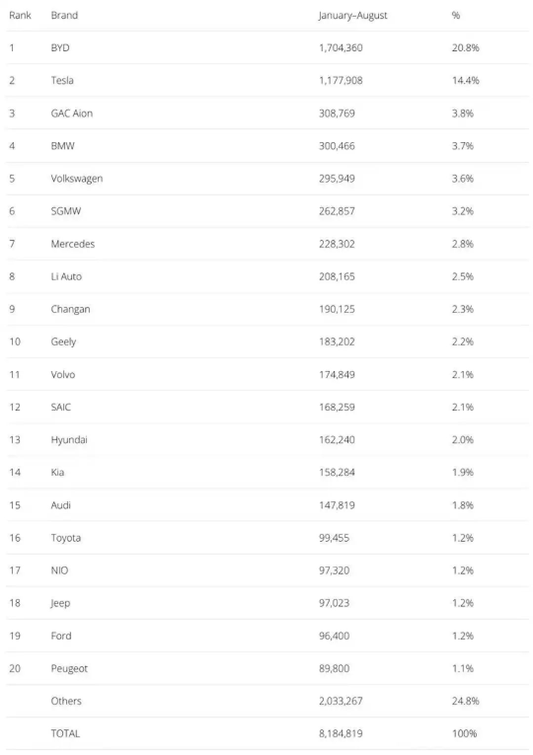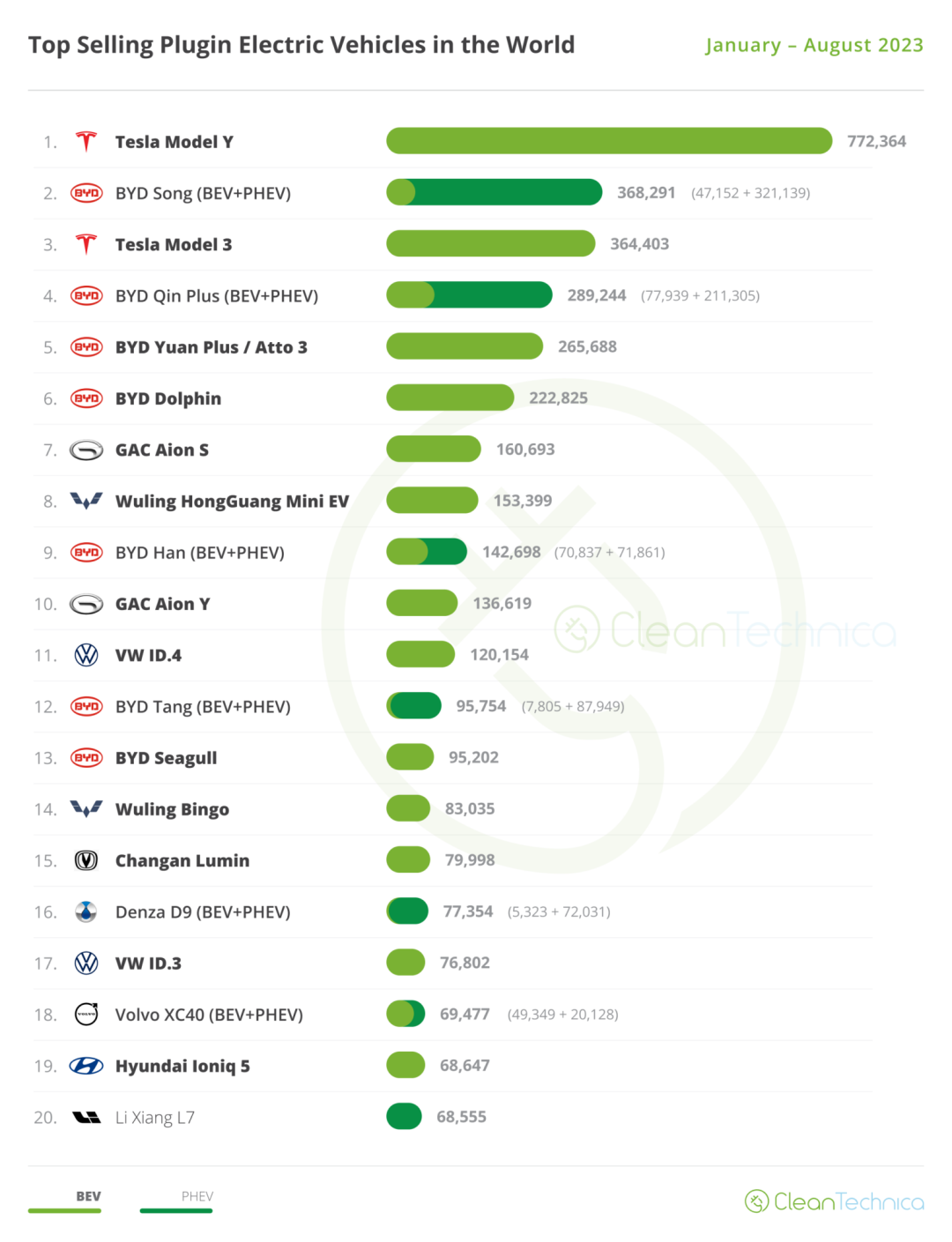幾天前, CleanTechnica 公布了今年1-8月的全球新能源乘用車銷量數(shù)據(jù),不出意外的是,比亞迪和特斯拉的銷量遙遙領(lǐng)先,比亞迪取得了超過170萬輛的銷量,不過其中包括了插電式混合動力(PHEV)車型,緊隨其后的是特斯拉,接近118萬輛,純電動(BEV)車型銷量則超過比亞迪。