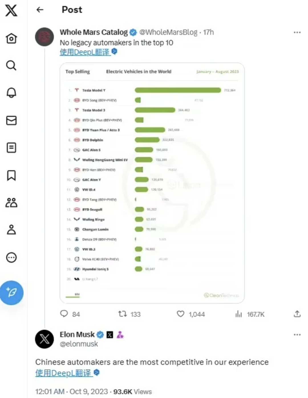今年前8個月,表現(xiàn)最亮眼的電動車創(chuàng)業(yè)公司莫過于理想汽車,月銷量屢創(chuàng)新高,而廣汽埃安是最接近比亞迪和特斯拉的電動車品牌——這兩家公司都來自中國,比起“新”、“傳統(tǒng)”的區(qū)別,可能地域的標(biāo)簽更重要。馬斯克在科技博主 Whole Mars Catalog 的推文中回復(fù)稱:“根據(jù)我們的經(jīng)驗,中國車企最具競爭力?!?/p>