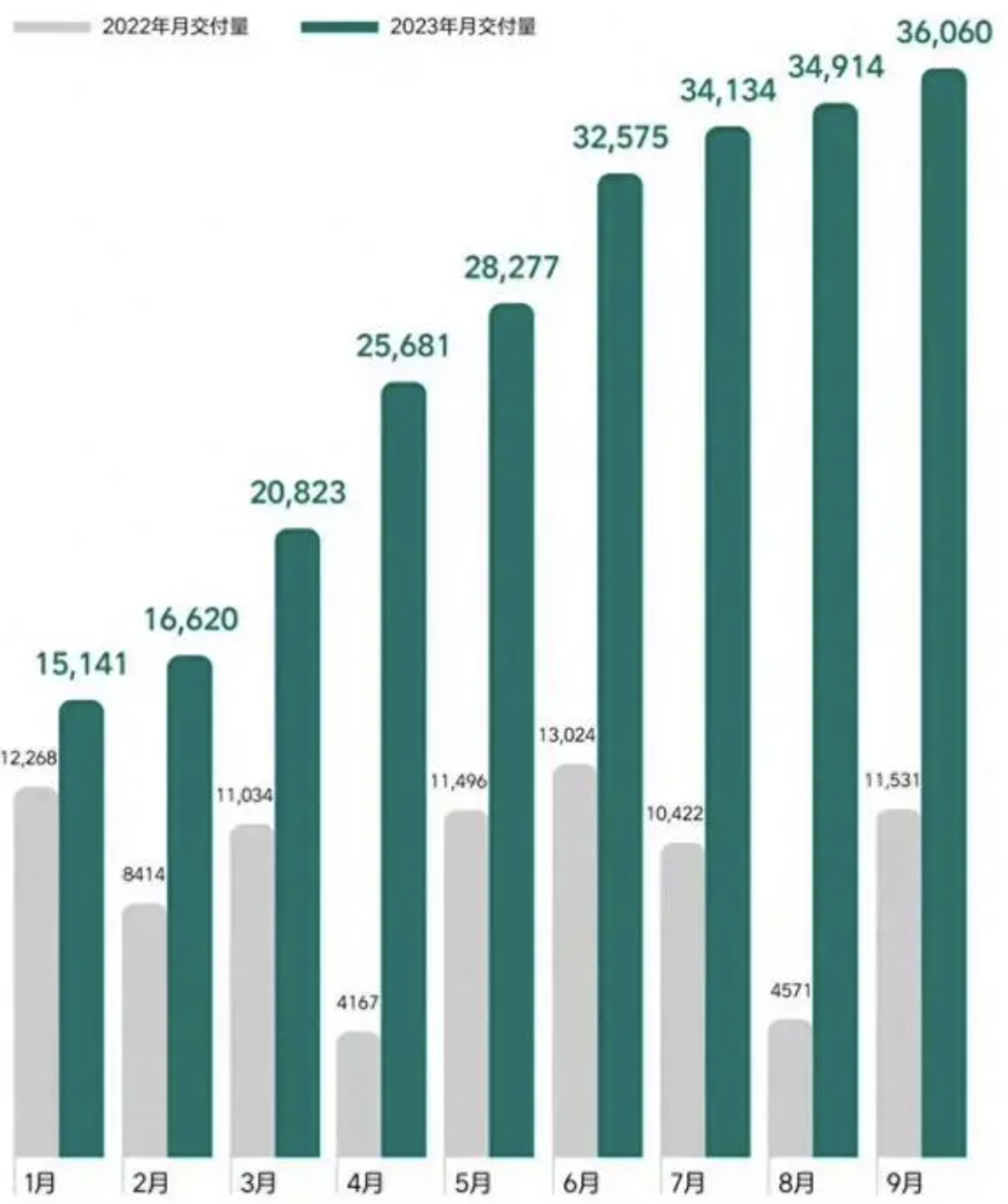 在9月,比亞迪依舊穩(wěn)坐第一,2023年比亞迪的銷售目標(biāo)是300萬輛,本年累計已經(jīng)實現(xiàn)了207萬輛,從目前的增長趨勢來看極有可能實現(xiàn)。