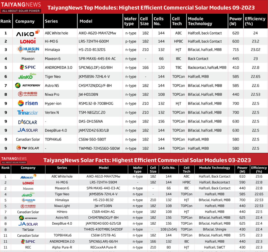 2023年3月、9月組件轉(zhuǎn)換效率TOP10;來源:TaiyangNews