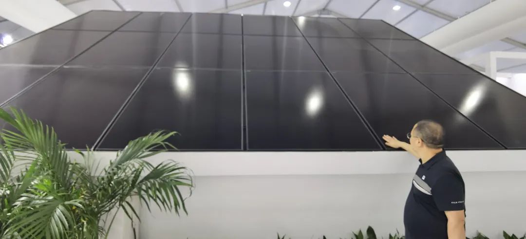 2023SNEC期間,一位觀眾走過愛旭ABC分布式光伏展臺(tái);趕碳號(hào)攝