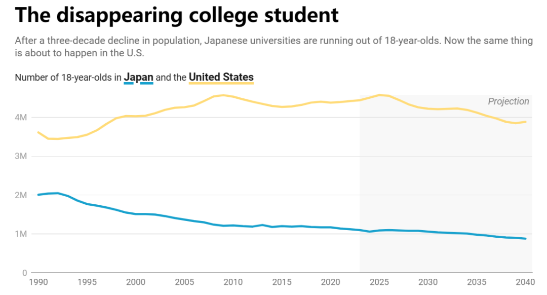 生源的急劇收縮已經(jīng)給日本高校帶來了巨大損失,并且將對(duì)社會(huì)和經(jīng)濟(jì)增長造成嚴(yán)重的后果——不僅如此,美國當(dāng)前也正在面臨著這種情況,一些州的 18 歲人口數(shù)量已經(jīng)開始下降,并且這種態(tài)勢很快將蔓延到全國。