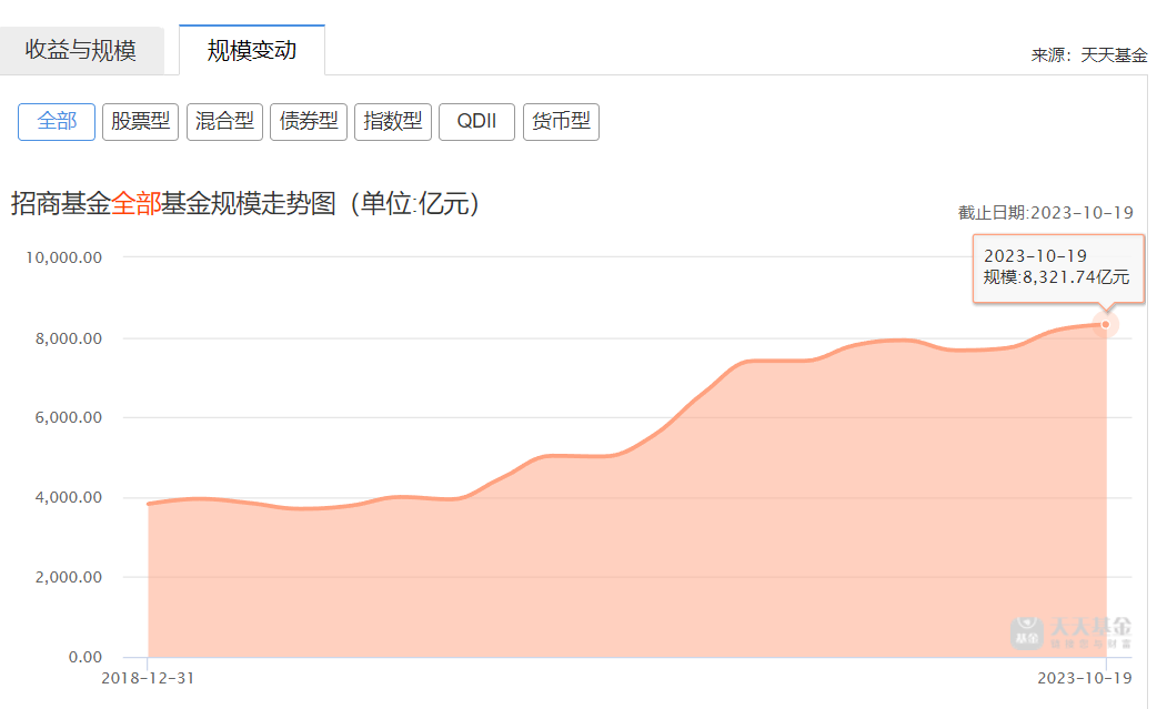 目前,以公募管理規(guī)模而言,銀行系基金中招商基金居于首位。截至2023年10月19日,招商基金在管規(guī)模8321.74億。其中非貨幣債券基金2127.27億,占比25.56%??傮w而言,還是貨幣債券基金占比偏高,這也是銀行系基金的共同特點(diǎn)。