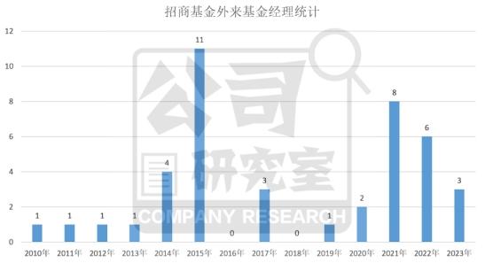 公司研究室注意到,早在2010年,招商基金就開始引進(jìn)外部基金經(jīng)理,隨著時(shí)間的推移,引進(jìn)人數(shù)與頻次愈發(fā)密集,且越發(fā)向權(quán)益類產(chǎn)品管理人傾斜。