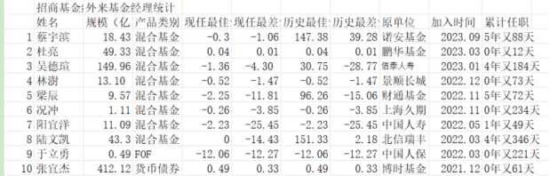 統(tǒng)計(jì)顯示,目前,招商基金42位外部引進(jìn)基金經(jīng)理中,有23人在管混合基金,11人在管貨幣債券基金,5人在管股票基金,3人在管FOF基金。特別是2022年至今,引進(jìn)的9人,除了一位管理FOF外,其余人全部管理混合基金。