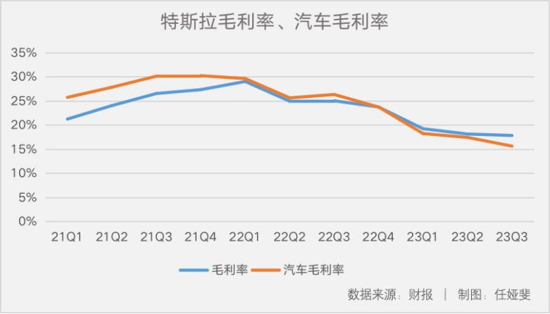但一系列的降價(jià)策略,也讓特斯拉的毛利率水平一路走低。進(jìn)入2023 年以來(lái),特斯拉毛利率連續(xù)三個(gè)季度下滑,從第一季度的19.3%一路跌至17.9%,其中最核心的汽車毛利率則環(huán)比二季度下滑了1.8%。要知道,從2021年第二季度開(kāi)始,特斯拉季度毛利率一度維持在24%~29%之間——這是一個(gè)豪華車企都難以企及的數(shù)字。