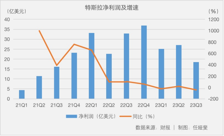 但進(jìn)入2023年后,特斯拉開(kāi)啟大規(guī)模降價(jià)促銷策略,使得單車盈利環(huán)比大幅下滑,比亞迪為應(yīng)對(duì)價(jià)格戰(zhàn)也采取了降價(jià)措施,但由于其產(chǎn)品在10萬(wàn)~20萬(wàn)元價(jià)格區(qū)間有著穩(wěn)固的市場(chǎng)地位,所面臨的市場(chǎng)競(jìng)爭(zhēng)不強(qiáng),因此比亞迪并未采取激進(jìn)的措施提振銷量。2023年Q1,特斯拉單車?yán)麧?rùn)約為0.59萬(wàn)美元,比亞迪單車?yán)麧?rùn)約為0.66萬(wàn)元。到第三季度,特斯拉單車盈利已經(jīng)降至0.41萬(wàn)美元,同比和環(huán)比分別下降62.2%、21.2%。作為對(duì)比,比亞迪2023年三季度單車凈利潤(rùn)升至約1.04 萬(wàn)元(以比亞迪預(yù)告的扣非凈利潤(rùn)中值測(cè)算,且剔除比亞迪電子利潤(rùn))。