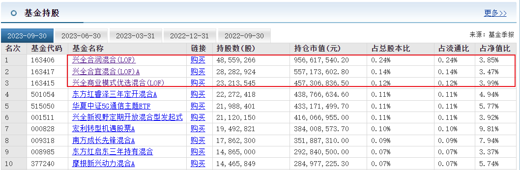 根據(jù)東方財富網(wǎng)數(shù)據(jù),截至9月30日,持有工業(yè)富聯(lián)前10的基金中,興全合潤混合(LOF)、興全合宜混合(LOF)A、興全商業(yè)模式優(yōu)選混合(LOF)分別持股4855.9萬股、2828.3萬股、2321.3萬股。