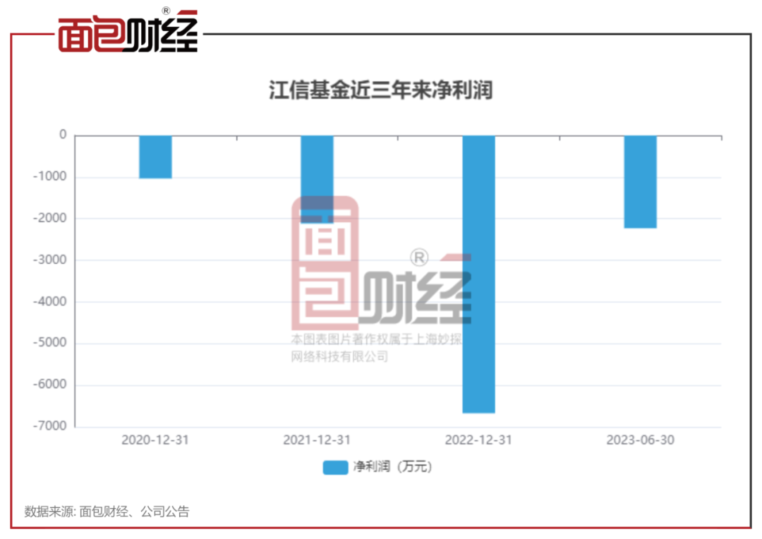 此外,江信基金自2020年以來凈利潤持續(xù)虧損。根據(jù)披露信息,江信基金2021年凈利潤虧損2115.89萬元,2022年虧損擴(kuò)大,凈利潤為-6671.15萬元。2023年上半年,江信基金虧損2229.97萬元。