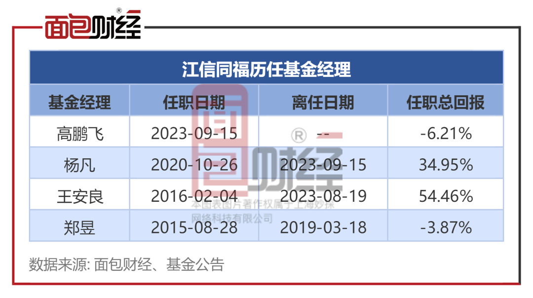 江信同福的基金經(jīng)理為高鵬飛,2023年9月接手該基金。數(shù)據(jù)顯示,成立8年以來,江信同福已歷任4位基金經(jīng)理,其中基金于今年8月以來相繼解聘基金經(jīng)理王安良、楊凡。