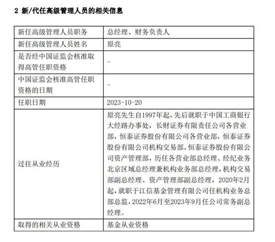 10月20日,江信基金發(fā)布高級(jí)管理人員變更公告,焦毛因個(gè)人原因離任總經(jīng)理與代任督察長職務(wù);原副總經(jīng)理原亮轉(zhuǎn)任總經(jīng)理、財(cái)務(wù)負(fù)責(zé)人。同日,鄭清麗離任副總經(jīng)理、財(cái)務(wù)負(fù)責(zé)人,轉(zhuǎn)任督察長;遇浩亮任副總經(jīng)理。