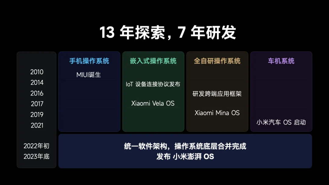 2019年,小米并行研發(fā)純自研通用系統(tǒng)Mina OS。2021年,小米開啟了車機(jī)OS的研發(fā)。2022年初,小米統(tǒng)一MIUI、Vela、Mina、車機(jī)OS四個系統(tǒng)的軟件架構(gòu),至此小米的操作系統(tǒng)底層合并完成。