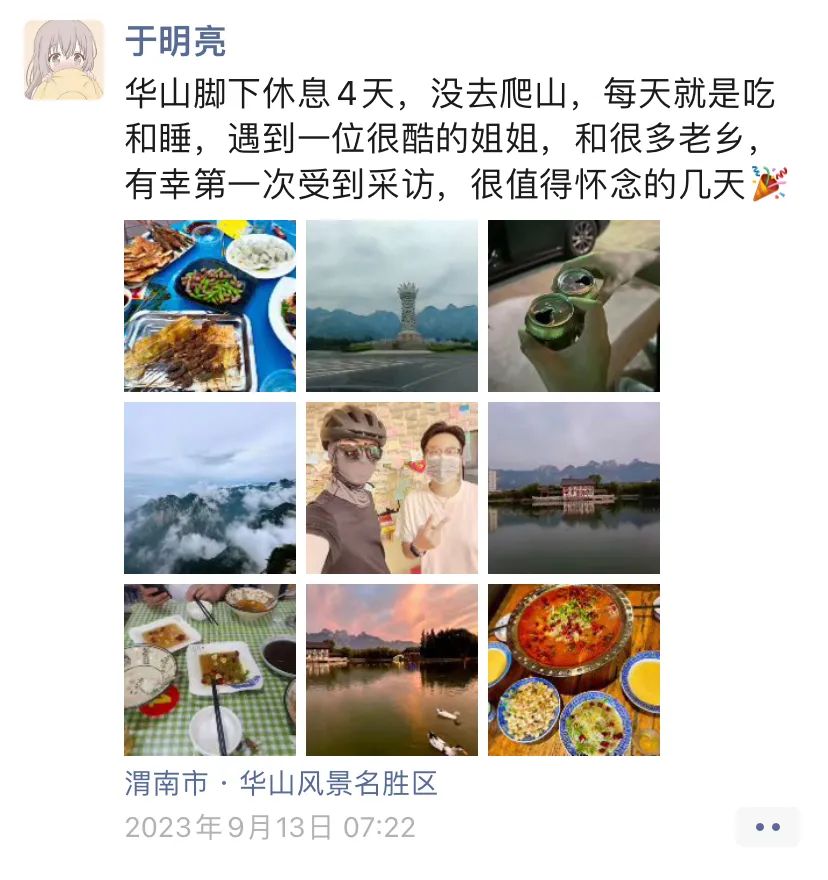 于明亮想起壓力最大的那個夏天,他停止了一周直播,前往中國最東邊的一個城市游玩,“在那里看到了第一縷日出”,他發(fā)現(xiàn),只有走出房間,才能夠卸下過載的情緒。于是,于明亮花300塊買了一輛自行車,開始騎行,他小時候喜歡騎自行車,如今重拾了這個愛好。